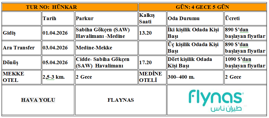 4 Gece 5 Gün, Suudi Arabistan Kültür ve Umre Turu, Gidiş: 01.04.2026