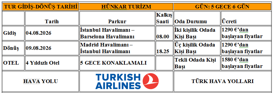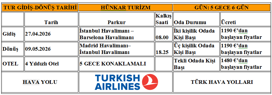 ‣ Türk Havayolları ile İstanbul – Barselona / Madrid – İstanbul gidiş dönüş ekonomi sınıfı uçak bileti